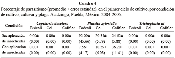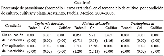 Hubo baja correlación positiva entre el número de larvas y número de parasitoides emergidos (r= 0.4156, p=0.0485), y entre el número de larvas y el porcentaje de parasitismo también fue positiva pero no significativa (r= 0.0864, p=0.6948). El más alto porcentaje de parasitismo fue del 50% registrado en mayo del 2004 y febrero del 2005, con densidades de 2.4 y 0.2 larvas por planta, respectivamente. Los porcentajes con las más altas densidades poblacionales de larvas en el cultivo fueron de 5.2% en el primer ciclo (7.7 larvas por planta), de 14.6% en el segundo (4.1 larvas por planta) y de 2.6% en el tercero (7.6 larvas por planta). En el mismo orden, en el cultivo donde se aplicaron insecticidas fueron de 26.5% (3.4 larvas por planta), 9.5% (2.1 larvas por planta) y 0.0% (0.2 larvas por planta); el parasitismo fue menor hasta en 59.53%, pero se observaron porcentajes del 50% y 100% en junio del 2004 y marzo del 2005, con población de 0.2 larvas por planta. Estos resultados son diferentes a lo reportado por Mitchell et al. (1997) en el condado de Flagler, Florida, Estados Unidos, quienes encontraron que el número de parasitoides colectados y la densidad de larvas de P. xylostella no se correlacionaron, pero el porcentaje de parasitismo y la densidad de larvas estuvieron correlacionadas; asimismo, reportaron tasas de parasitismo en larvas del 3.2% en marzo y del 72% para principios de mayo.