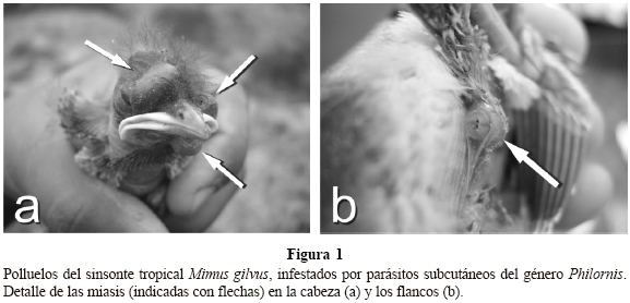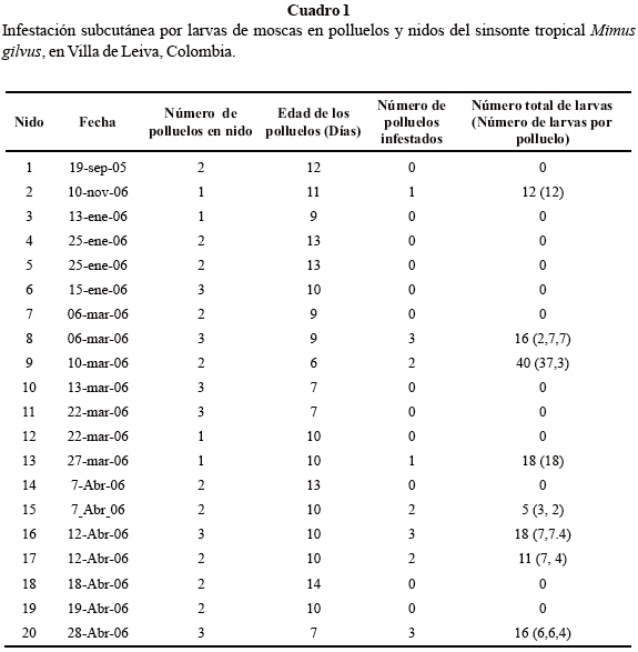 De septiembre de 2005 a abril de 2006 observamos 20 nidos y 42 polluelos del sinsonte tropical en la vereda Ritoque del municipio de Villa de Leiva, Boyacá, Colombia ("lat 05°36'23"N", "long 73°32'38"W"). Diecisiete polluelos (en ocho nidos) presentaron algún grado de infestación por Philornis, principalmente en las áreas del abdomen, la cabeza y los flancos (Cuadro 1, Fig. 1). En los nidos donde se encontraron larvas, todos los polluelos resultaron afectados por las miasis. También se observaron larvas abandonando el cuerpo del hospedero poco tiempo después de su muerte.