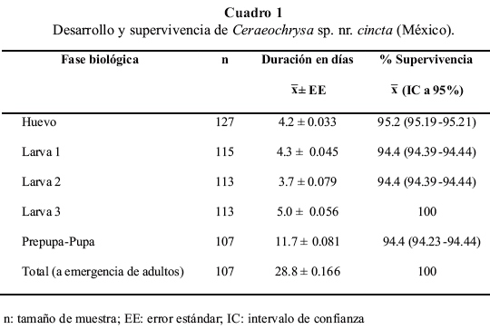 El desarrollo de los diferentes estados biológicos, desde huevo hasta la emergencia de adultos, fue de aproximadamente cuatro semanas, valor similar al estimado para Ceraeochrysa sp. nr. cincta (USA) y otras especies de Chrysopidae, como Ceraeochrysa cubana (Hagen) y Ceraeochrysa smithi (Navás) (López-Arroyo et al. 1999b), aunque mayor al señalado para algunas especies de Chrysoperla (Burke & Martin 1956, Afzal & Khan 1978, Tauber & Tauber 1982a y 1982b, Elkarmi et al. 1987, Núñez 1988, Albuquerque et al. 1994).