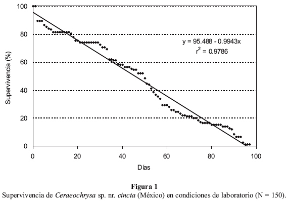 El ciclo biológico de C. sp. nr. cincta (México), desde huevo hasta la emergencia del adulto, fue de aproximadamente cuatro semanas. El huevo eclosionó en un promedio de 4.2 días; la larva de primer estadio (L1) presentó una duración similar (4.3 días) a la del huevo. La duración promedio del segundo y tercer estadio larval (L2 y L3) fue de 3.7 y 5.0 días, respectivamente. El estado de pupa fue completado en 11.7 días en promedio. El periodo de huevo hasta la emergencia de adultos fue de 28.8 días. El rango de supervivencia para las etapas biológicas desde huevo hasta la emergencia de los adultos de C. sp. nr. cincta (México) fue de 94-100%, con un promedio de 96.4% (Cuadro 1). La longevidad máxima desde huevo hasta la muerte del último adulto fue de 97 días. A partir de un valor máximo de 95.49% de supervivencia, ésta se reduce en 0.99% (aproximadamente 1%) por cada día que transcurre, durante el periodo de vida (G.L.= 96; Fc = 5908.07; p <0.0001; r2 = 0.984) (Fig. 1).