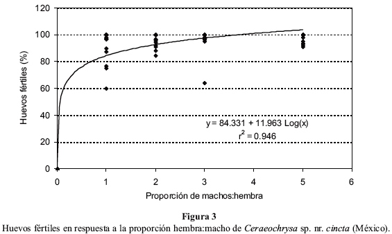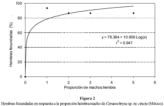 Este estudio fue realizado en respuesta a la baja fecundidad observada en hembras de C. sp. nr. cincta (México) en condiciones de laboratorio. El estudio se inició con hembras provenientes de la primera generación de C. sp. nr. cincta (México) producida en laboratorio, con el uso de la metodología descrita anteriormente. Se evaluaron las siguientes proporciones de hembras y machos: 1:0, 1:1, 1:2, 1:3 y 1:5, con 15 repeticiones por condición. Por cada proporción, los machos permanecieron junto con la hembra hasta que el apareamiento ocurrió; esto fue registrado cuando se observó en la genitalia de la hembra la presencia del espermatóforo, o restos de éste en el piso de la caja donde permanecieron los adultos (López-Arroyo et al. 1999c). Los machos fueron separados de la hembra al iniciar éstas la oviposición; posteriormente fueron añadidos al registrarse un declinamiento en las oviposturas y fueron mantenidos nuevamente por un periodo de uno a siete días, hasta que existía evidencia de un nuevo apareamiento (presencia del espermatóforo). Los machos fueron separados de la hembra cada vez que se reiniciaba la oviposición. Este proceso se repitió durante toda la vida de la hembra. Los machos al morir fueron sustituidos por otros de la misma edad para así mantener las proporciones sexuales evaluadas. Diariamente se les proporcionó a los adultos agua y el alimento previamente descrito. Se efectuaron observaciones diarias bajo un estereoscopio para registrar en cada condición el porcentaje de hembras fecundadas, periodo de preoviposición, periodo de oviposición, huevos producidos por hembra, fertilidad y número de apareamientos.