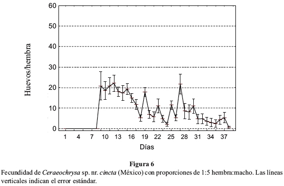 El estudio se inició con tres cohortes de 50 huevos cada uno, provenientes de la primera generación de C. sp. nr. cincta (México) producida en laboratorio. Los huevos recién ovipositados por las hembras que permanecieron en los recipientes de unicel, fueron colectados y depositados individualmente en viales de vidrio con tapa de algodón hasta completar los tres cohortes. Antes de la eclosión de la larva y en los días subsecuentes, se proporcionó para su alimentación huevos de la palomilla de los graneros, Sitotroga cerealella (Olivier) (Lepidoptera: Gelechiidae). Para diferenciar los estadios larvarios, se consideró la exuvia que dejaba la larva en cada ecdisis. Al pupar, se colocó una banda de cartón en la pared del vial para que el adulto que emergiera tuviese un sustrato para sostenerse y desplegar alas y antenas. Después que los adultos emergieron, se colocó una pareja por recipiente de unicel (una hembra y un macho mantenidos permanentemente) alimentados con la dieta previamente descrita. Se realizaron observaciones diarias bajo el estereoscopio para registrar cambios biológicos, además del inicio de oviposición, proporción de hembras en oviposición, cantidad y fertilidad de huevos ovipositados, y mortalidad. La fertilidad de los huevos se determinó cada ocho días en una muestra de 15 huevos/hembra. En el análisis de tablas de vida (Krebs 1985), se consideró una proporción sexual de 1:1, debido a que del total de especimenes en el experimento, 48 fueron hembras y 53 machos; esta proporción de hembras y machos, es indicada para crisópidos por diversos autores citados por Canard & Principi (1984).