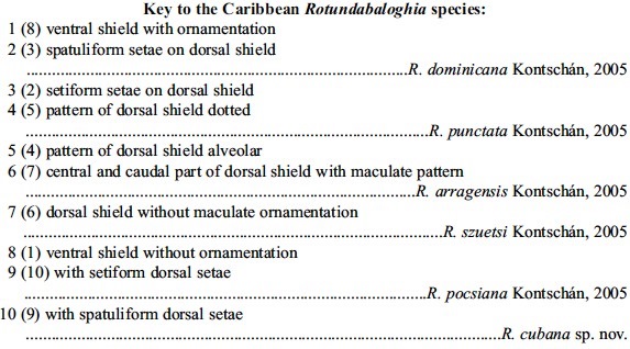 From the all Caribbean islands, Cuba has the most investigated Uropodina fauna, up till now 34 Uropodina species are published from Cuba (Wisniewski 1993. Acarologie 40:221- 291), but no Rotundabaloghia species have hitherto been found in Cuba (Wisniewski 1993. op. cit.).