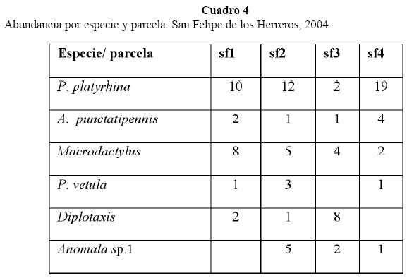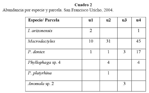Como se muestra en los Cuadros 2 y 3, la abundancia de individuos y la riqueza de especies son diferentes en cada parcela. La parcela con mayor riqueza de especies (5 especies) y mayor abundancia de larvas es u4. La parcela con menor índice de equitatividad y mayor índice de dominancia es u2, debido a la dominancia de Macrodactylus sp. por lo cual su índice de diversidad es también el menor.