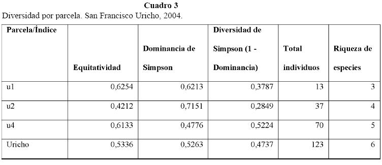 Para el cálculo de índices de diversidad se empleó el software estadístico Biological Tool Box versión 0.10 para Excel. Los índices que se seleccionaron fueron Equitatividad, Dominancia de Simpson, Diversidad de Simpson (1 - Dominancia), debido a que son mas sensibles a especies dominantes y su influencia en la diversidad. Equitatividad= H/Hmax; donde H es Diversidad de Shannon-Wiener; Hmax es Ln (S) del número de especies. Dominancia Simpson= s SUM (pi)^2; donde s es número de especies; pi es proporción de los individuos por especie. Diversidad Simpson= 1-C; donde C es el valor del índice de Dominancia de Simpson.