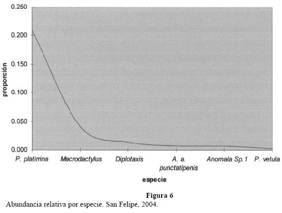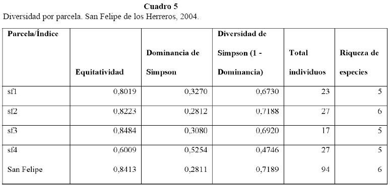 Como se muestra en los Cuadros 4 y 5 la abundancia de individuos y la riqueza de especies se mantiene más constante. La parcela con mayor riqueza de especies (6 especies) es sf2, la cual a su vez presenta un bajo índice de dominancia y el más alto índice de diversidad, no es la más equitativa debido a la abundancia de P. platyrhina. La parcela mas equitativa es sf3, debido a que no hay dominancia de ninguna especie por lo que su índice de diversidad es el mas alto. La parcela menos equitativa es sf4, debido a la abundancia de P. platyrhina, por lo que su índice de dominancia es el mas alto y de diversidad es el mas bajo