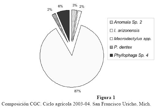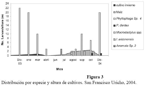 Durante la colecta de octubre 2003, en el periodo de rastreo para la siembra de cultivos de invierno, en 5 parcelas se registraron 104 larvas de las cuales 38% correspondieron a P. dentex, 29% a Macrodactylus sp., 25% a I. arizonensis y 1.9% Phyllophaga sp.4. Esta información sugería que las dos especies de Phyllophaga podrían representar un riesgo para el maíz. Con el resultado del muestreo mensual se corrobora que Phyllophaga sp.4. es la que puede estar afectando al maíz (Fig. 3).