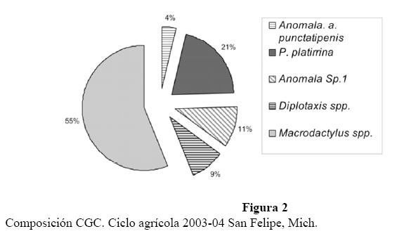 El género mas abundante es Macrodactylus sp. el cual se presenta especialmente durante el periodo de invierno donde probablemente se resguarda bajo plantas arvenses que crecen durante el periodo de descanso (enero a octubre), (Fig. 4). En este mismo periodo coexisten tres especies mas, Anomala sp 1, Diplotaxis, Anomala puncatipennis y P. platyrhina. Bajo la cobertura de maíz, la especie más abundante y constante es P. platyrhina. Esta información sugiere que la especie que podría afectar el desarrollo del cultivo de maíz es Phyllophaga platyrhina.