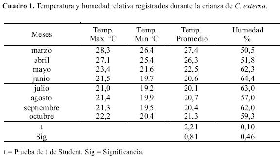 Las unidades de oviposición fueron forradas por dentro con papel kraft, para recuperar los huevos ovipositados, teniendo cuidado en fijarlo bien a las paredes internas del envase para evitar que las crisopas quedaran atrapadas entre el papel y las paredes del envase. También se colocó papel kraft con una abertura cuadrada de 3 cm de lado a manera de tapa, asegurándola con una liga y sobre ésta se colocó la tapa del envase, a la cual previamente se le había hecho una abertura central de 5 cm de diámetro, que se cubrió con organza y se fijó con pegamento (Terokal") por sus bordes; sobre la cual se puso algodón humedecido con agua. Las parejas de C. externa fueron alimentadas con las dietas correspondientes, éstas les fueron proporcionadas en paletas plásticas de 10 x 3 cm formando una línea delgada, para evitar que las crisopas quedaran pegadas al alimento. Las evaluaciones se realizaron para la primera generación (Rango de Temperatura Promedio de 20,6 ° a 27,4 °C entre marzo a junio del 2005) y para la segunda generación (Rango de Temperatura Promedio de 20,1 °C a 21,3 °C entre julio y octubre del 2005) de C. externa.