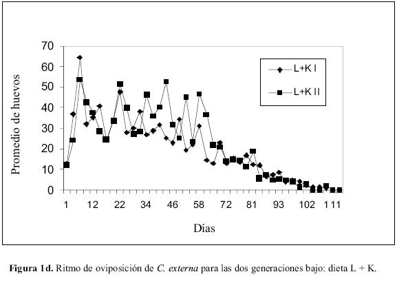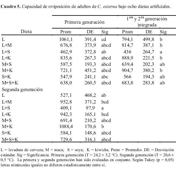 Capacidad de oviposición. Se determinó la cantidad total de huevos obtenidas de C. externa para cada dieta durante dos generaciones (Cuadro 5). El promedio de huevos en la dieta estándar de la primera generación, y L+M, L+K, M+K de la segunda generación fueron mayores al resto de tratamientos (F = 3,8; p = 0,000). Al evaluar la capacidad de oviposición integrada de C. externa, las dietas L, L+M, L+K y M+K fueron mayores al resto de tratamientos (F = 4,0; p = 0,000) (Cuadro 5).