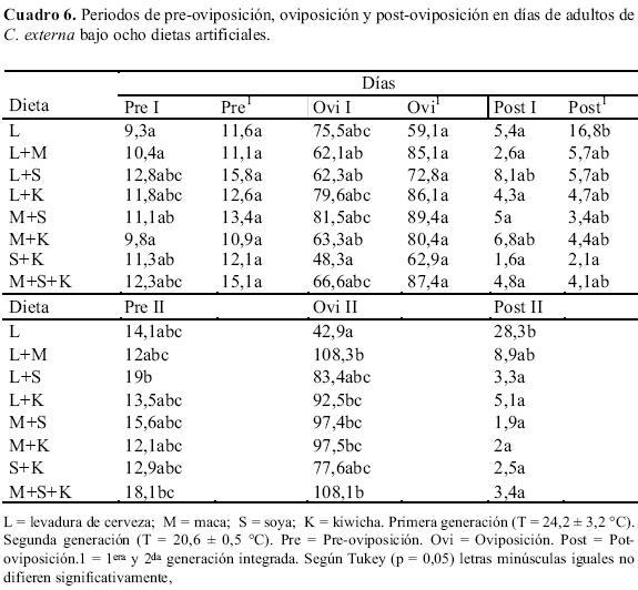 Periodo de pre-oviposición, oviposición y post-oviposición. El periodo de pre-oviposición para C. externa indicó diferencias significativas entre el tratamiento L+S y M+K+S de la segunda generación con respecto a L y M+K para la primera generación (F = 3,1; p = 0,000) (Cuadro 6). El periodo de pre-oviposición para la primera y segunda generación integrada fue similar entre los ocho tratamientos (F = 2,4; p = 0,027). El periodo de oviposición, en la primera generación fue similar entre los tratamientos, pero hay diferencias entre los tratamientos para la segunda generación, siendo mayor el periodo para las dietas L+M, L+K, M+S, M+K y M+S+K con respecto al resto de tratamientos (F = 5,2; p = 0,000) (Cuadro 6). El periodo de oviposición para la primera y segunda generación integrada fue similar entre los ocho tratamientos (F = 2,7; p = 0,013). En el periodo de post-oviposición todos los tratamientos son similares entre sí, entre la primera y segunda generación. Solo la dieta L de la segunda generación fue diferente al resto de tratamientos (F = 2,1; P = 0,013) (Cuadro 6). El periodo de post-oviposición para la primera y segunda generación integrada fue similar entre los ocho tratamientos, siendo solo la dieta estándar mayor que el resto de tratamientos (F = 2,1; p = 0,05).