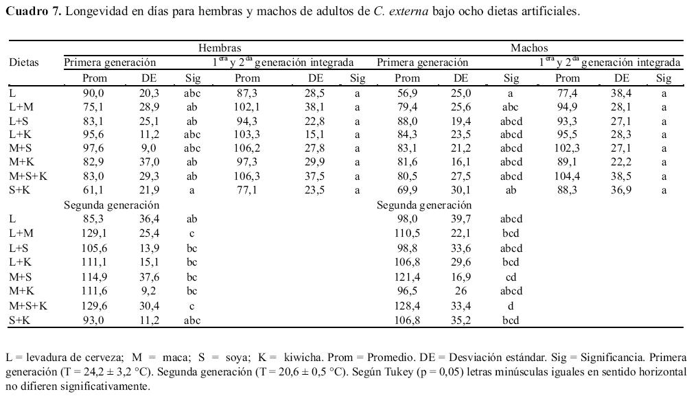 Longevidad de hembra y macho. Las longevidades de hembras y machos de C. externa con las ocho dietas empleadas en la primera y segunda generación por separado difieren significativamente entre sí (F = 3,7 a 4,7; p = 0,000) (Cuadro 7). Existieron diferencias en las longevidades para las hembras de la segunda generación en comparación con el resto de tratamientos, siendo las hembras de las dietas L+M y M+S+K más longevas en comparación con las hembras de las otras catorce dietas (F = 4,8; p = 0,000). No existieron diferencias significativas en la longevidad de las hembras bajo las ocho dietas artificiales (F = 2,0; p = 0,06). La longevidad de los machos de las dietas M+K y M+S+K de la segunda generación en relación al resto de dietas ensayadas fueron mayores (F = 3,8; p = 0,000). No existieron diferencias significativas en la longevidad de los machos bajo las ocho dietas artificiales (F = 1,2; p = 0,32) (Cuadro 7). La longevidad en hembras y en machos se ve influenciada por la temperatura, siendo numéricamente mayor en la segunda generación (24,2 ± 3,2 °C) en comparación con la primera (20,6 ± 0,5 °C). Sin embargo, no existieron diferencias significativas en la temperatura promedio entre ambas generaciones (t = 2,2; p = 0,069). El mismo patrón se observó para la Humedad relativa entre ambas generaciones (t = 0,8; p = 0,45) (Cuadro 1).