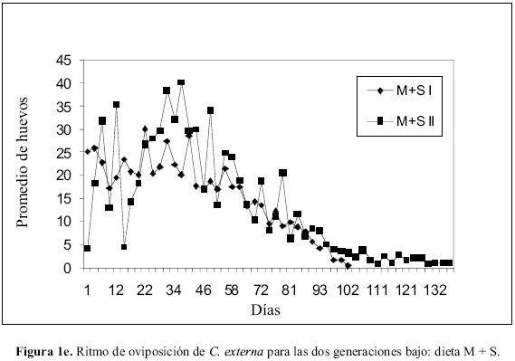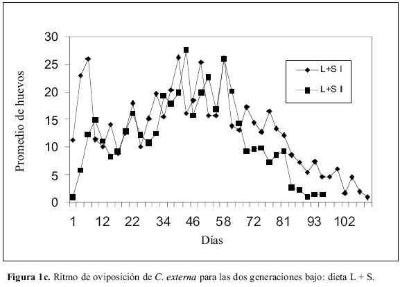 Ritmo de oviposición. Las hembras de C. externa no oviponen de forma constante durante su periodo de oviposición, su ritmo de oviposición es variable y está relacionado con la temperatura y la humedad relativa, como se puede ver en las Fig. 1a-h (1b, 1c, 1d, 1e, 1f, 1g). En la primera generación los ritmos de oviposición se ven influenciados por las altas temperaturas de los meses de Marzo y Abril, pues en promedio los picos de máxima postura para la mayoría de los tratamientos se encuentran en la primeras tres semanas a diferencia de la dieta estándar (levadura de cerveza) que presenta su pico de máxima postura en la quinta semana, coincidiendo con los resultados obtenidos por Lizárraga & Cañedo (1988) donde señalan que el pico máximo de postura de C. externa se encuentra entre la cuarta y quinta semana cuando es alimentada con levadura de cerveza. Barbosa et al. (2002) al alimentar a los adultos con levadura de cerveza y miel encontraron el pico máximo en la tercera semana. Lizarraga & Cañedo (1988) y Boregas et al. (2003) indican que los ritmos de oviposición de C. externa son influenciados directamente por los diferentes tipos de dietas.