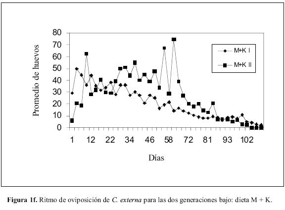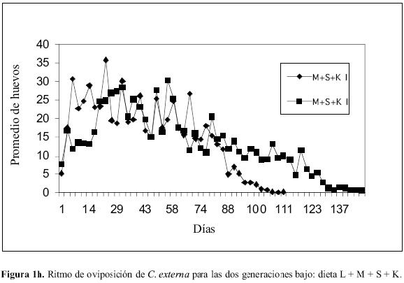 Comparando los ritmos de oviposición de las dos generaciones para cada dieta, se obtuvo una diferencia significativa para los días 8 y 43 (t = 2,2; p = 0,04 y t = 5,4; p = 0.000). Para la dieta L+M (Fig. 1b) se obtuvieron diferencias en los días: 29 (t = 3,6; p = 0,03), 43 (t = 3,8; p = 0,002), 50 (t = 3,6; p = 0,02), 59 (t = 4; p = 0,01), 66 (t = 4; p = 0,01), 73 (t = 2,3; p = 0,03). En la dieta M + K (Fig. 1f) se obtuvo diferencias en los días 1(t = 3,7; p = 0,003), 8 (t = 3,9; p = 0,002), 29 (t = 3,6; p = 0,003), 36 (t = 5,2; p = 0,000), 43 (t = 4,2; p = 0,001) 50 (t = 3,3; p = 0,005), 59 (t = 3,7; p = 0,002) y 66 (t = 3,7; p = 0,003). Además para la dieta S+K (Fig. 1g) se encontraron diferencias significativas en los días 12 (t = 2,6; p = 0,01), 50 (t = 2,6; p = 0,02), 59 (t = 3,4; p = 0,004) y 66 (t = 3,1; p = 0,008). Mientras que para el resto de dietas no se obtuvieron diferencias estadísticas significativas en diferentes fechas.