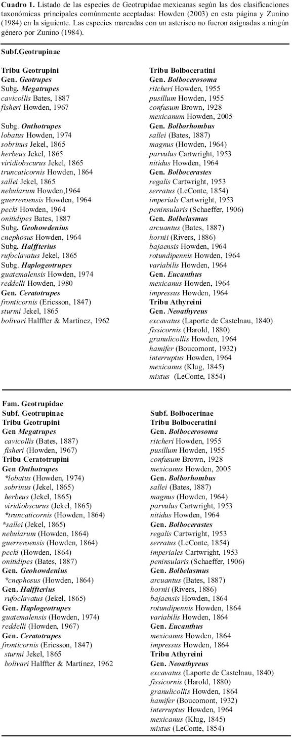 Se elaboró una base de datos recopilando toda la información disponible en la bibliografía, así como en diversos estudios no publicados a los que se ha tenido acceso (tesis de licenciatura, maestría y doctorado), destacando los trabajos de Howden (1955, 1964, 1974, 2003, 2005); Halffter & Martínez (1962); y, Gómez & López-Rojas (2004). También se consultaron diversas colecciones entomológicas, como las colecciones particulares de G. & V. Halffter, E. Montes de Oca, F. Vaz de Mello, M. A. Morón, H. F. & A. Howden, I. Martínez, L. Arellano, así como la colección del Instituto de Ecología A. C. (Xalapa, Veracruz, México)