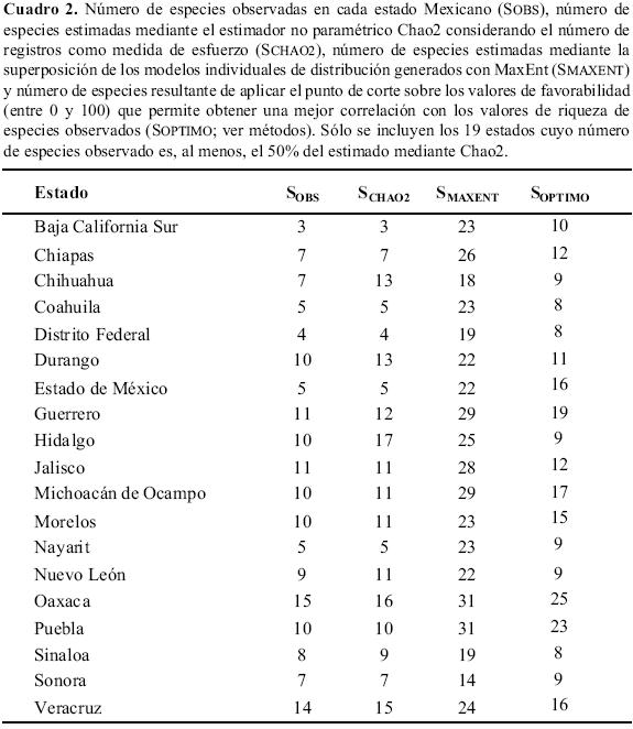 Estimar la capacidad de los modelos obtenidos para reflejar con fiabilidad la distribución de los organismos es un requisito esencial para que estas hipótesis sean útiles en conservación y biogeografía (Vaughan & Ormerod 2005). Debido a la escasez de datos disponibles, la precisión de las hipótesis de distribución generadas fue estimada superponiendo cada uno de los modelos individuales obtenidos y calculando el número total de especies resultantes en distintos estados de México, cuyo inventario completo fue previamente estimado como fiable (Cuadro 2). Para calcular si el número conocido de especies en cada estado representa una estima fiel de la riqueza total existente, se calculó el estimador no paramétrico Chao2 (Colwell & Coddington 1994), algoritmo que considerando el número de especies que aparecen en una o dos unidades de esfuerzo permite establecer la riqueza teórica total. En nuestro caso, se utilizó como medida de esfuerzo el número de registros existentes en GEOMEX de cada especie para cada estado de México (Hortal et al. 2006). Los cálculos fueron realizados mediante el programa EstimateS (Colwell 2000).