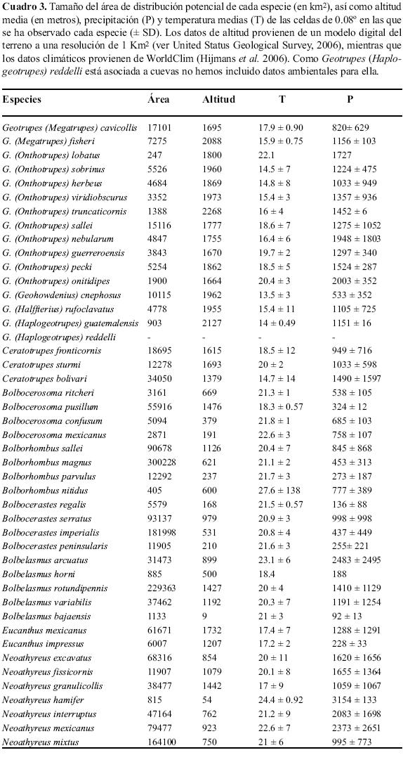 Los datos topográficos y climáticos de los puntos de presencia de cada una de las especies, así como el tamaño del área potencial de distribución aparecen en el Cuadro 3. Las especies de las tres principales tribus de Geotrupinae aparecen en diferentes condiciones ambientales. En lo que respecta a la altitud, la tribu Geotrupini se encuentra distribuida desde los 1500 y los 3200 metros. Sin embargo los Bolboceratini y Athyreini presentan una altitud media menor, casi desde el nivel del mar hasta los 1700 metros en la primera, y desde los 50 a los 1400 metros la segunda. Respecto a los valores climáticos, los Geotrupini se encuentran presentes en territorios con valores de precipitación mínima anual entre los 500 y los 2000 mm, temperaturas mínimas de alrededor de 14ºC y máximas de 22º C. Por otra parte, los Bolboceratini se encuentran entre valores de precipitación mínima de 90 mm y máxima de 2500 mm, temperaturas mínima de 17º y máxima de 23º C. Los Athyreini se encuentran presentes en enclaves con valores más altos de temperatura y precipitación que los otros dos grupos; precipitación mínima de 990 mm, precipitación máxima de 2400 mm, temperatura mínima de 17º y máxima 24º C (Cuadro 3).