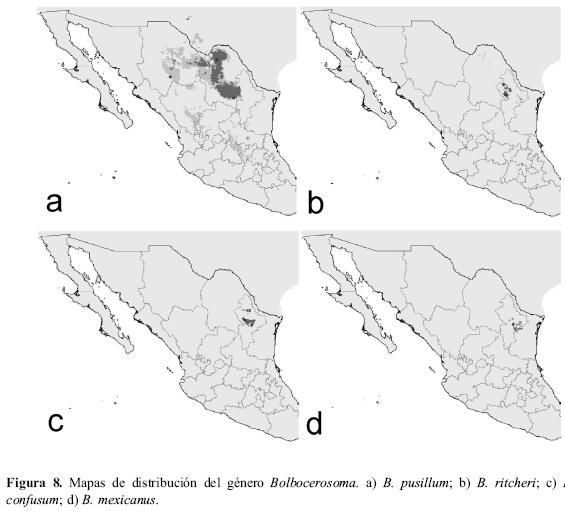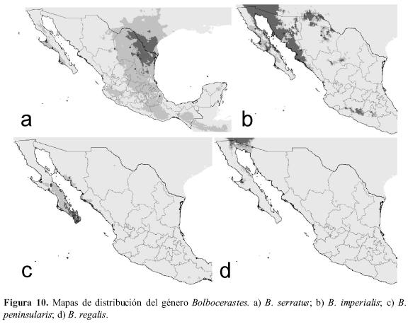 Este es otro género neártico presente en la Zona de Transición Mexicana, habitando localidades entre los 160 y los 1000 metros con temperaturas medias en torno a los 20º C y precipitaciones entre 130 y 250 mm (Cuadro 3). La mayor parte de las especies de este género se encuentran distribuidas por la mitad occidental de México, mientras que sólo una especie habita en la mitad oriental. Así, B. serratus se distribuye principalmente por el noreste de México, aunque potencialmente podría también estar presente por toda la costa oriental, sobre todo hacia el estado de Tamaulipas (Fig. 10a). Por el contrario, B. regalis, B. peninsularis y B. imperialis aparecen principalmente en la zona noroccidental de México (estados de Baja California, Sonora y, para la última, también Chihuahua). Bolbocerastes imperialis presenta la distribución más extensa, ampliando la distribución potencial su presencia hasta el Altiplano y la Depresión del Balsas (Fig. 10b). Bolbocerastes peninsularis ha sido colectada en Baja California y su distribución potencial sólo amplia en diversos puntos su rango conocido (Fig. 10c). Por último, B. regalis se distribuye por los estados de Baja California Norte y Sonora. El mapa de distribución potencial sugiere que la distribución de esta especie podría ampliarse a otras localidades de la misma región (Fig. 10d).