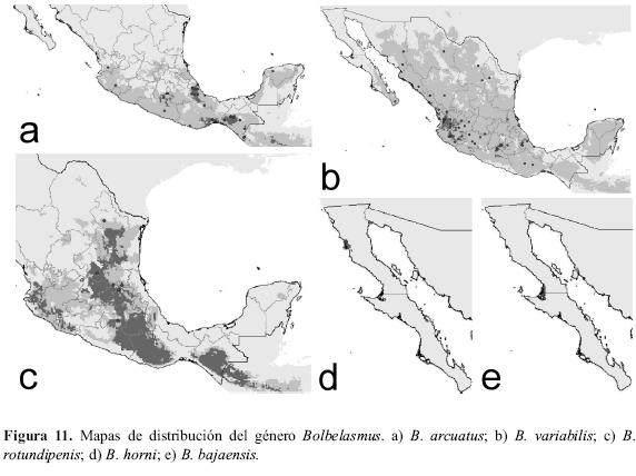 Bolbelasmus arcuatus es una especie de distribución básicamente Neotropical, que se extiende en la República Mexicana por la región central y meridional, mostrando una distribución potencial que amplia notablemente su área conocida (ver Fig. 11a). B. variabilis es la especie mexicana que presenta una distribución más amplia, incluyendo la región Neártica y la Neotropical, y siendo más abundante hacia la costa oeste, donde se ampliaría su distribución potencial (Fig. 11b). Bolbelasmus rotundipennis se distribuye exclusivamente por la zona central de México, aunque su distribución potencial muestra que su rango podría extenderse hacia las costas occidentales y orientales, la Sierra de Chiapas y Guatemala (Fig. 11c). Por último, B. bajaensis y B. horni presentan distribuciones muy restringidas en Baja California; de B. horni solamente se conoce una cita puntual de la localidad de Ensenada (Fig. 11d) y de B. bajaensis de la localidad de Mulege (Fig. 11e). Los mapas potenciales apenas amplían su distribución conocida como consecuencia de la escasez de datos.