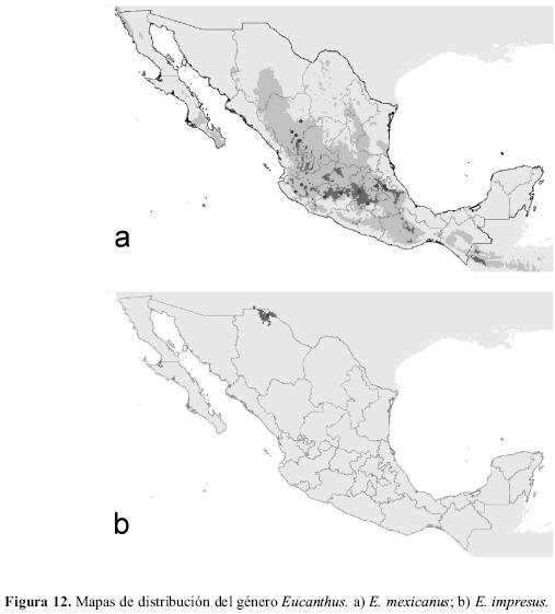 Este género posee una amplia distribución, incluyendo las regiones Neártica, Neotropical y Australiana (Howden 2003), aunque en México solo pueden encontrarse dos especies, una de ellas endémica (E. mexicanus) distribuida por el Sistema Volcánico Transversal y la Sierra Madre Occidental. La distribución potencial de E. mexicanus sugiere una extensión de área conocida en el Sistema Volcánico Transversal y también en la Sierra de Chiapas (Fig. 12a). Eucanthus impressus se extiende principalmente por el norte de México mostrando una distribución observada y potencial restringida al norte del estado de Chihuahua (Fig. 12b). Ambas especies se localizan en enclaves con temperaturas medias en torno a los 17ºC, aunque E. mexicanus habita localidades con mayores precipitaciones medias (1280 mm) que E. impressus (230 mm; Cuadro 3).