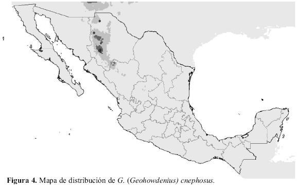 Éste es un subgénero neártico (Howden 2003), que presenta una sola especie en México, G. cnephosus, con una distribución bastante restringida hacia zonas con precipitaciones bajas (alrededor de 500 mm) y temperaturas templado-frías (13ºC; Cuadro 3). Tanto su área de distribución potencial, como su distribución conocida, corresponden a la parte norte de la Sierra Madre Occidental (Fig. 4). Esta especie está muy relacionada con G. opacus Haldeman 1853 y G. egeriei Germar, 1824, que presentan una amplia distribución en los Estados Unidos.