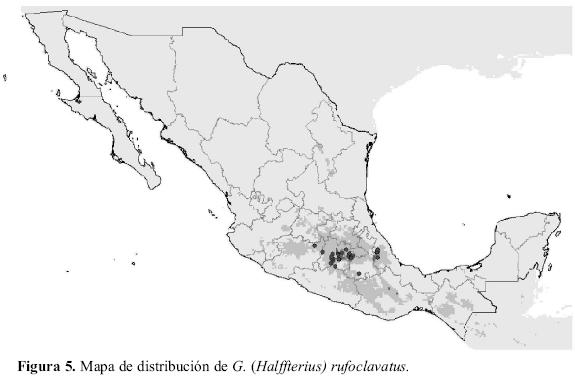Este subgénero esta compuesto por una única especie, G. rufoclavatus (Fig. 5), endémica de México. Su distribución conocida se limita al Sistema Volcánico Transversal, habitando praderas o claros de bosque de pinos, encinos y oyameles situados a partir de los 1900 m (Howden 2003), en localidades con una temperatura media de unos 15 ºC y una precipitación media de 1100 mm (Cuadro 3). La hipótesis de distribución potencial generada extiende su presencia hasta la Sierra Madre Oriental, la Sierra Madre del Sur y Chiapas.