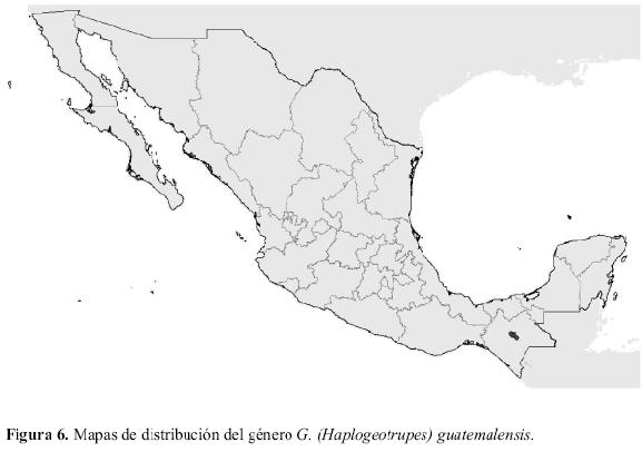 Al igual que el resto de Geotrupini, Haplogeotrupes es un subgénero neártico. Los mapas de distribución potencial de las especies de este subgénero coinciden con los de su distribución conocida. En el caso de G. redelli no se han elaborado mapas de distribución potencial ya que, al tratarse de una especie troglobia, sería erróneo estimar su distribución enbase a variables climáticas del medio exterior. Únicamente ha sido citada de las cuevas de Tasalolpan y Xochitlan en el estado de Puebla. En el caso de G. guatemalensis solamente se conocen citas muy puntuales del Estado de Chiapas (Fig. 6), en concreto de la localidad de San Cristóbal de las Casas, aunque su distribución se extiende hacia Guatemala. Los mapas de distribución potencial para esta especie muestran escasas localidades adicionales muy cercanas a la localidad de colecta.