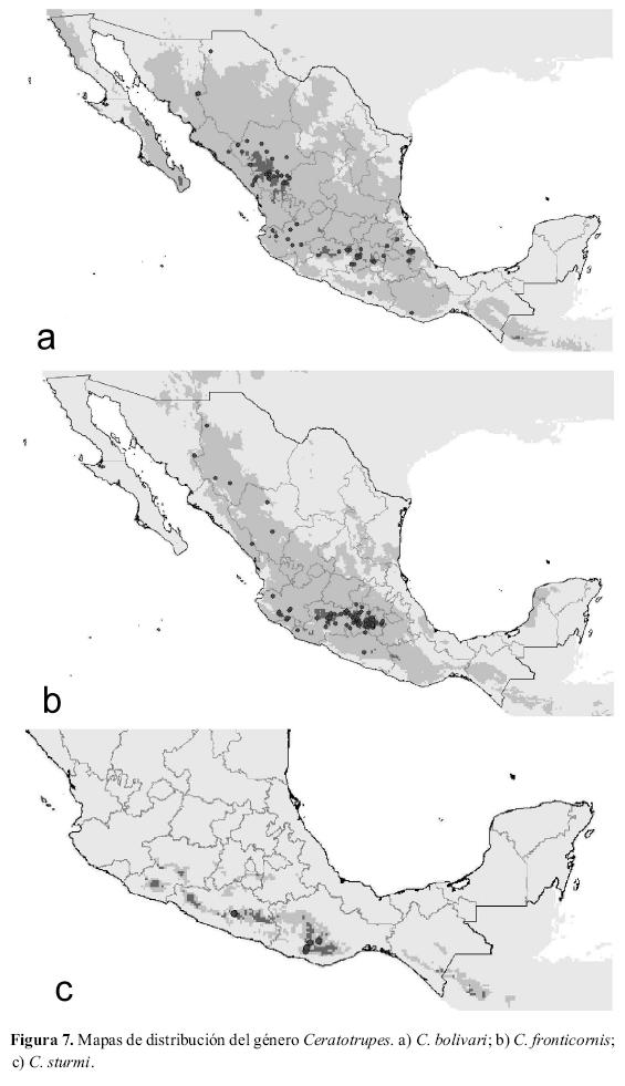 Los mapas potenciales obtenidos indican que las tres especies de este género solaparían sus áreas de distribución en los estados de Oaxaca y Guerrero, extendiéndose también por Chiapas y Guatemala, aunque no se han observado individuos de Ceratotrupes al este del estrecho de Tehuantepec. Ceratotrupes bolivari (Fig. 7a) es la especie del género que presenta una distribución más amplia llegando hasta el norte de México. Ceratotrupes fronticornis (Fig. 7b) también se distribuye por el norte de México, aunque parece ser capaz de habitar en el occidente del país. Por último, C. sturmi (Fig. 7c) es la especie que presenta una distribución más restringida, habitando únicamente diversas áreas de los estados de Oaxaca y Guerrero.