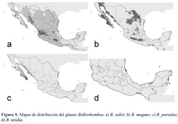 Bolborhombus sallei y B. magnus muestran distribuciones amplias, estando presente la primera en casi todo el territorio mexicano, salvo en algunas zonas del Golfo de México y de la Península de Yucatán. Los datos de distribución potencial para B. sallei amplían su presencia en zonas de la costa oeste (Fig. 9a). Bolborhombus magnus se distribuye por el Altiplano Mexicano y el Sistema Volcánico Transversal; su mapa potencial amplia su rango hasta Baja California, Sonora y la Depresión del Balsas (Fig. 9b). Bolborhombus parvulus y B. nitidus presentan distribuciones mucho más restringidas; la primera se distribuye por Baja California, Sinaloa y Sonora, y la segunda en Michoacán (Fig. 9c, d). Las distribuciones potenciales para estas dos especies no amplían apenas su rango de distribución, salvo algunos puntos dispersos en Baja California y en Michoacán para B. nitidus.