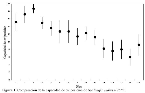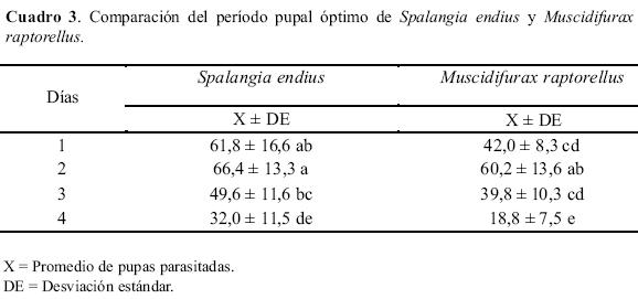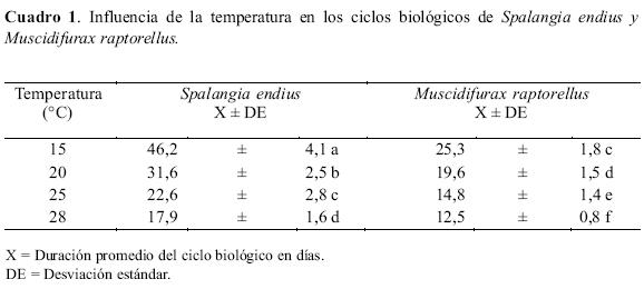 Ciclo biológico. Los valores hallados por la mayoría de autores, coinciden con los obtenidos en este trabajo, las pequeñas diferencias pueden ser explicadas debido a ciertas variaciones en las condiciones de la crianza de los parasitoides, como humedad y temperatura. Moreno (1980) al estudiar la biología comparada de ambas microavispas encontró que a 26 °C las hembras de S. endius tuvieron un ciclo de 25 días y los machos, 23 días; mientras que las hembras de M. raptorellus tuvieron un ciclo biológico de 18 días y los machos, de 17 días. En nuestro estudio, la duración del ciclo biológico fue de 22,6 días y para M. raptorellus fue 14,8 días. Como puede observarse para el caso de S. endius obtuvimos valores inferiores a los Moreno (op cit.). Mamani (1984), a 25 °C reporta la duración del ciclo biológico de S. endius en 21,5 días. A mayor temperatura el ciclo se hizo más corto y también el rango, para ambos sexos, datos que coinciden con lo reportado por Moreno (1980) y Mamani (1984). A 15 °C se observa mejor la emergencia de los parasitoides adultos y es recomendable esta temperatura con fines de conservación de pupas de moscas parasitadas, en un sistema de producción masiva. También se han reportado algunos datos sobre estudios de los ciclos biológicos de otras especies de Spalangia y Muscidifurax.; así, Kogan & Legner (1970) reportan entre 22 y 24 días el ciclo biológico de M. raptor y para M. raptorellus una duración de entre 17 a 21 días a 26 ± 1 °C y 75 ± 5 HR. Al estudiar el ciclo de vida y hábitos de Spalangia cameroni Perkins, Ortiz y Torres (1983) observaron que el ciclo biológico de esta especie duraba 15 días. Morgan et al. (1991) encontraron para Spalangia gemina Boucek que duraba 22 días a 25,5 °C. Mann et al. (1990b) encontraron para Muscidifurax raptor Kogan & Legner, M. zaraptor Kogan & Legner, S. cameroni y S. endius, una duración del ciclo biológico de 20,7 días, 22,8 días, 35,8 días y 31,5 a 25°C.