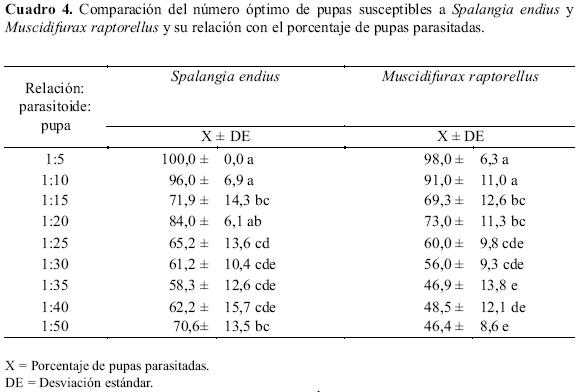 Se observó que el parasitismo en ambas microavispas, estuvo influenciado significativamente por el número de pupas expuestas al parasitismo entre los límites de 10 y 50 pupas de mosca/hembra del parasitoide. Esto concuerda con las ecuaciones de regresión lineal que son estadísticamente significativas, con una tendencia a disminuir el porcentaje de pupas parasitadas con el incremento de pupas expuestas a ambos parasitoides: S. endius (Y = 94,65 - 0,76X; F = 9,29; gl = 1 y 7; R2= 0,57) y M. raptorellus (Y= 97, 85 - 0,95 X; F = 68,3; gl = 1 y 8; R2=0,90) donde Y = Número de pupas parasitadas y X = densidad de pupas expuestas. El ANDEVA resultó estadísticamente significativo (F = 24,4; gl = 17 y 162; P = 0,00). El número óptimo de pupas para exponer a ambos parasitoides fue 10 (relación 1:10). La Prueba de comparación múltiple de Tukey, nos muestra que las relaciones 1:5 y 1:10 fueron diferentes para ambos parasitoides. El análisis entre ambas especies a una misma densidad de pupas, muestra que en todas las relaciones pareja de parasitoides: pupas de mosca, excepto en la última (relación 1: 50) no existieron diferencias significativas (Cuadro 4).