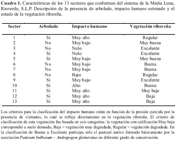 Este sistema está formado por una laguna-manantial de donde parten una serie de canales, con influencia de humedad por infiltraciones laterales a distancias variables de la fuente constituyendo un humedal, que en época húmeda incluye a dos lagunas estacionales cercanas, a distancias de 800 y 1200 m al sur y sureste respectivamente. La variabilidad ambiental se representó por la porción acuática, el pastizal nativo con sus diferentes grados de antropización y zonas con arbolado ribereño, donde se establecieron 13 sectores cuya estructuración se muestra en la Figura 1. Este sistema tiene uso turístico que ha repercutido en la estructura y calidad de la vegetación acuática y ribereña de manera tal que actualmente algunos sectores están muy antropizados (Cuadro 1).