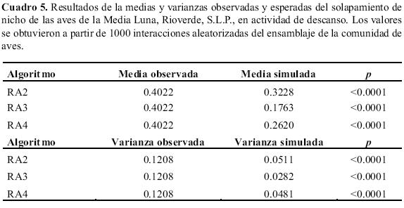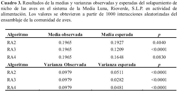 Para el análisis de solapamiento en actividad de descanso se dejaron fuera las especies que aparecieron de manera muy esporádica y con un número muy escaso de individuos, tales como: E. caerula, Nyctalassa violácea L., Anhinga anhinga L., y Ceryle torquata L., realizándose el análisis con las 15 especies remanentes. Los resultados altamente significativos para las medias y para las varianzas muestran que el solapamiento de nicho medio observado fue mayor que el simulado para los tres algoritmos (Cuadro 5). Los tres algoritmos mostraron solapamiento en esta actividad; la mayor diferencia entre las medias estuvo dada por RA3.