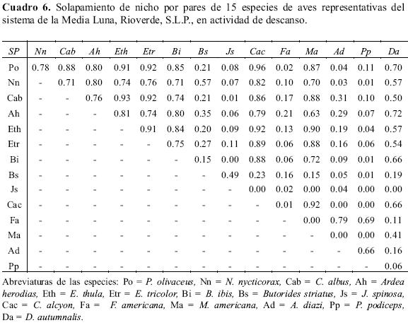 En el Cuadro 6 se muestran los resultados del solapamiento de nicho para los pares de especies en actividad de descanso. La mayoría de las aves (67%) comparten sitios de descanso en los árboles y muestran solapamiento elevado (>70 %) entre ellas, con gran contraste respecto a las que no usan los árboles.