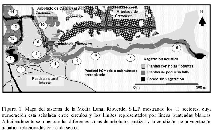 La creación de cartografía base de la zona de la Media Luna se basó en la ortofoto digital (F14-C16f) suministradas por el Instituto Nacional de Estadística, Geografía e Informática (INEGI) y una ampliación adicional de fotografía aérea (F14-7) a escala de 1:7500. Esta foto se corrigió con el programa ER Mapper 6.4 a partir de la ortofoto digital georreferenciada. La distribución de la vegetación se realizó mediante la fotografía aérea y numerosos datos de campo. Para la obtención de los mapas de tipos de vegetación terrestre y acuática se emplearon 6 y 4 categorías respectivamente, así mismo se digitalizaron los límites de los sectores y la presencia de canales secundarios; estas capas se superpusieron para obtener la Figura 1.