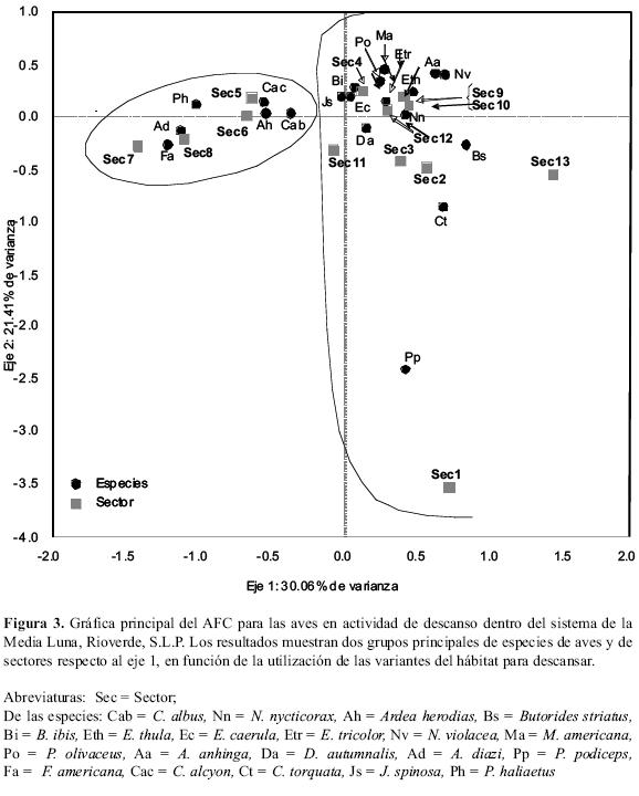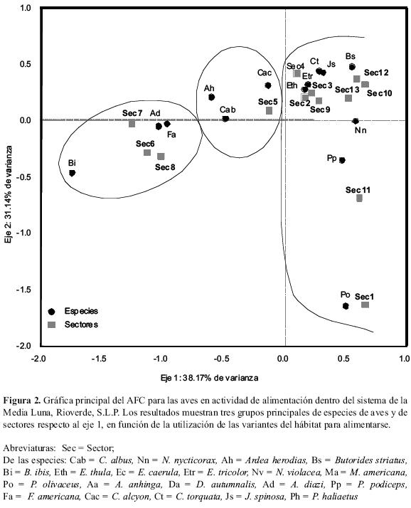 Las especies registradas como R (residentes) en el Cuadro 2 se reprodujeron en la zona en diferentes variantes del hábitat, algunos como M. americana L. anidan en una arboleda a aproximadamente 10 kilómetros de distancia de la Media Luna, siendo el sitio de anidación más lejano registrado (Palacio-Núñez 1997). No se observó competencia interespecífica por los sitios de anidación. Se observó que las aves dividieron su tiempo básicamente entre sesiones de alimentación y descanso. Estas dos actividades fueron consideradas las variables de agrupación para analizar la distribución de las especies entre los sectores de la Media Luna, para esto se realizaron pruebas de análisis factorial de correspondencias (AFC) tomando la abundancia de cada una de las especies en cada circunstancia; usando el programa Statistica 6.0 (StatSoft 2001).