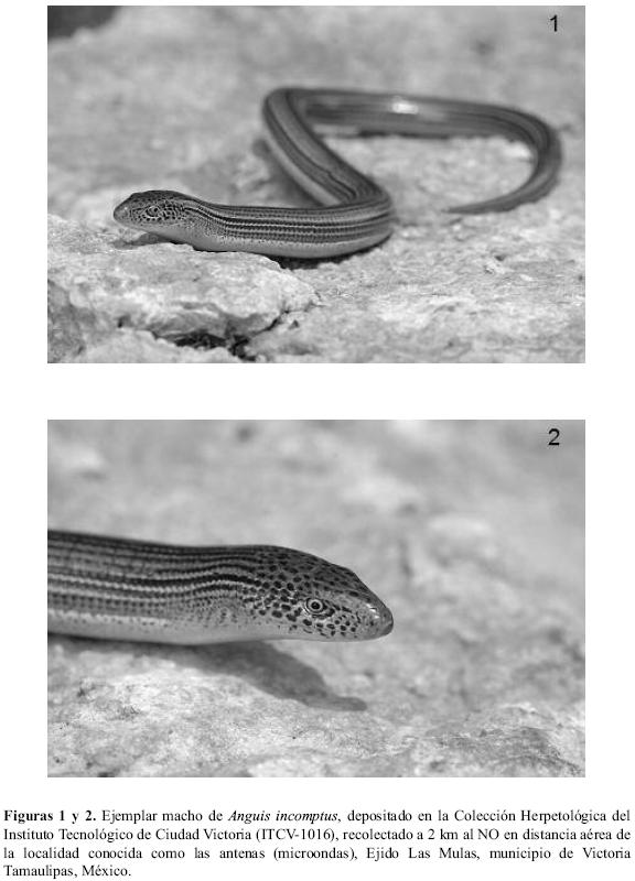 El 5 de julio del 2006 encontré en el Área Natural Protegida "Altas Cumbres" (ANPAC) en la Sierra Madre Oriental de Tamaulipas, un ejemplar macho de Anguis incomptus (ITCV-1016; Figs. 1 y 2) a 2 km al NO en distancia aérea de la localidad conocida como las antenas (microondas), Ejido Las Mulas, municipio de Victoria. El tipo de vegetación del área corresponde a un chaparral de encino (Quercus sp.). El individuo se encontró activo por la mañana (8:30 h), a una altitud de 1565 m, en un área con afloramientos de grandes rocas. Este registro representa el primero verificado para esta especie en el estado de Tamaulipas, y representa una extensión en la distribución de 240 km al NO de Ciudad Valles, San Luis Potosí (Holman. Op. cit.), y de 150 km al NO de La Reata, Aldama, Tamaulipas (Alfaro-Reyna. Op. cit.), ambos en distancia aérea. Así mismo, constituye el registro de mayor altitud (1565 m) de los previamente referidos para el género en el país (Casas-Andreu et al. Op. cit.), y permite suponer que A. incomptus es una especie alopátrida, con poblaciones tanto en bosques tropicales como templados.