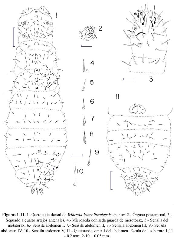 Discusión. La nueva especie es cercana a Willemia bedosae D'Haese, 1998, pero esta última presenta la sensila e1 del antenito IV; el número de vesículas del OPA es de siete, las sensilas del abdomen II-III son lanceoladas y presencia de la seda m4 en el abdomen IV. W. Iztaccihuatlensis no presenta la sensila e1, OPA con ocho vesículas, sensilas lanceoladas en el abdomen I-III y ausencia de la seda m4 en abdomen IV; el promedio de la uña III: espina anal es de 1:0.4 (W. bedosae), contra 1:0.5. Al compararla con W. similis Mills, 1934, encontramos la presencia de la seda m1 en el abdomen IV y la p2 en el V. en relación a W. anophthalma, Börner, 1901, el número de sedas hr en la válvula anal es de 2 (Cuadro 1).