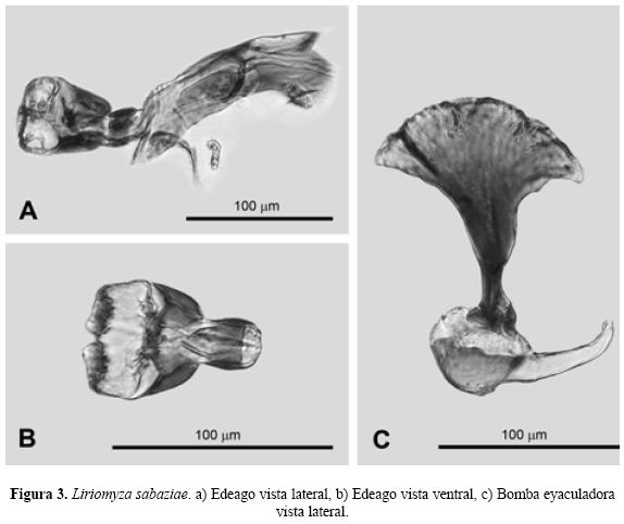 Discusión. Spencer (1963) describe a esta especie como Liriomyza bulnesiae, en su descripción el autor indica que ésta presenta caliptra gris, margen caliptral negro y flecos grisáceos y que ambas cerdas verticales (vt) de la cabeza están insertadas sobre cutícula negra. A su vez, Spencer & Stegmaier (1973) sinonimizan a L. bulnesiae como L. brassicae, pero mencionan que la caliptra presenta coloración amarilla, el margen caliptral y los flecos negros y la cerdas verticales (vt) insertadas sobre cutícula negra. De tal manera que el material examinado sobre L. camara L. es más similar al material examinado por Spencer (1963) sólo difiriendo en la coloración de la cutícula donde se insertan las cerdas verticales internas (vti), ya que ésta es amarilla. Además todos los ejemplares mantienen los caracteres específicos en el edeago y bomba eyaculadora. Por otra parte, es el primer registro en México y el primero sobre un miembro de la familia botánica Verbenaceae, Lantana camara L.