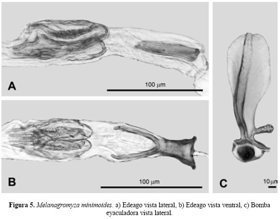 Discusión. El esquema de Spencer (1973) no presenta el edeago completo en vista lateral, falta una parte del distifalo. En vista ventral sí presenta las características de la especie. Se utilizaron los esquemas de los genitales publicados por Steyskal (1972), donde se aprecia el edeago completo.