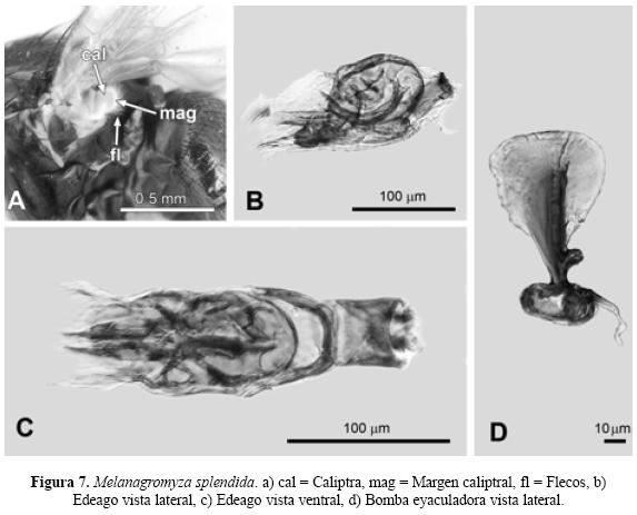 | 5. | Edeago en vista lateral con el distifalo que en su parte distal baja se aprecian dos terminaciones separadas (Fig. 7, B), y Edeago vista ventral el distifalo no presenta constricción y termina con dos líneas medias separadas. Los brazos del basifalo forman una U bien definida con su base plana (Fig. 7, C), y bomba eyaculadora con el tallo central del apodema que no llega al borde distal y el contorno del margen distal es aplanado (Fig. 7, D) ............................................... Melanagromyza splendida Frick |