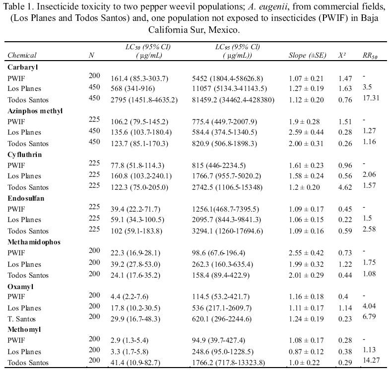 Weevil populations. We carried out toxicological tests on two field populations of pepper weevil, obtained from two major pepper growing areas in BCS, where the conventional use of insecticides is common. The study also included a population of weevils that was kept isolated from insecticides during two years (PWIF), at the Experimental Field of the Centro de Investigaciones Biologicas del Noroeste (CIBNOR) in La Paz, BCS. PWIF was originally collected from field populations from Todos Santos, BCS. The two field populations were collected from commercial pepper fields of the farming localities "Todos Santos" and "Los Planes" (At 23°58'N, 109°59'W and 23°26'N, 110°13'W, respectively), in BCS, both sown with the popular commercial cultivar "Ancho San Luis"; a mild pepper type "Poblano". These two fields are geographically isolated from each other by natural mountain barriers, xerophytic vegetation, and non-agricultural land. At each locality, 10 to 12 kg of fallen fruits were collected and deposited in plastic containers of 60 cm diameter and 25 cm depth, with a hard mesh to separate fruits from the container's bottom, and delay fruit deterioration (Capinera, 2005). Containers were covered with a 500µ screen, and kept ventilated at 25 to 34 °C and 60 to 70 % relative humidity in the laboratory until the adult insects emerged. Weevils were collected from the plastic containers using a standard mouth-aspirator or "pooter" (Azrang 1976, Schauff 1986) and transferred to screened wooden cages of 25 x 25 x 40 cm, where they were kept for 48 hours on a diet of fresh cut "Ancho San Luis" pepper fruits. In the same season, a pepper crop was established at the CIBNOR's experimental field in an isolated area of 5 x 20 m to obtain the PWIF population described earlier. However, there is not robust evidence that this population effectively did not carry resistant genes.