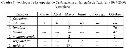 Cyclocephala Latreille. Se obtuvieron un total de 645 ejemplares atraídos por las luces, que representan a siete especies, con diferente composición en cada localidad. Cyclocephala lurida coahuilae y C. fasciolata solo se registraron en Chignautla, junto con C. sexpunctata y C.weidneri pero con distinta fenología (Cuadro 1). Cyclocephala lunulata solo se encontró en el km. 13 Teziutlán-Hueyapan, junto con C. jalapensis, C. melanocephala, C. sexpunctata y C. weidneri, pero también con diferente fenología (Cuadro 1). En el km. 9 Teziutlan-Martínez de la Torre, se capturaron C. jalapensis, C. melanocephala, C. sexpunctata y C. weidneri; en San Diego se colectaron C. jalapensis, C. melanocephala y C. weidneri; y en San Juan Acateno se obtuvieron C. jalapensis y C. weidneri. En resumen, las especies de este género mostraron dos períodos de vuelo, el primero durante las lluvias de primavera (mayo-junio) y el segundo en el período de máxima precipitación del año correspondiente al mes de octubre. Es interesante anotar que entre julio y septiembre no se capturó ningún ejemplar de Cyclocephala (Cuadro 1).
