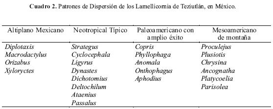 Relaciones faunísticas y aspectos zoogeográficos. Dentro de los patrones propuestos por Halffter (1976, 1978) para la Zona de Transición Mexicana, se observa que cuatro géneros y siete especies quedan situados dentro del patrón de dispersión en el Altiplano Mexicano; cuatro géneros y seis especies siguen el patrón Mesoamericano de Montaña; ocho géneros y quince especies siguen el patrón Neotropical típico; cinco géneros y dieciocho especies pertenecen al patrón de dispersión Paleoamericano con amplio éxito (Cuadro 2).