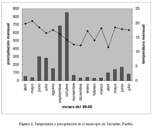 Área de estudio. Teziutlán se encuentra ubicado al norte del Estado de Puebla (Fig. 1), en la parte norte del eje neovolcánico, casi colindando con el estado de Veracruz, en las coordenadas 97° 21.6' lat. N y 19° 48.9' long W con una altitud entre 1,990 y 2,000 m.snm. (INEGI 1993a). Dentro de esta zona encontramos la cuenca llamada " La Gran Caldera de Teziutlán ". Los tipos de suelo que predominan en esta zona son los andosoles y regosoles, los cuales presentan un color grisáceo oscuro en la capa superficial y pardo o pardo amarillento en las capas mas profundas, son ricos en materia orgánica y tienen un alto contenido de nutrientes (INEGI 1993b). Predominan dos tipos de clima, el templado-húmedo con lluvias todo el año C(fm), y el templado-húmedo con abundantes lluvias en verano C(m). La región está sujeta a cambios bruscos de temperatura y presión debido a las perturbaciones atmosféricas del Golfo de México, sin embargo la temperatura solo varía entre los 12° y los 18°C (Fig. 2) (INEGI 1993a).