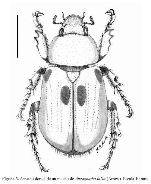 Ancognatha Erichson. Se colectaron 26 ejemplares de A. falsa (Fig. 3) atraídos por las luces de la trampa o el alumbrado público en Chignautla, el km. 13 Teziutlán-Hueyapan, San Diego, y el km. 9 Teziutlán-Martínez de la Torre, durante febrero (2), mayo (20), junio (4) y julio (2).