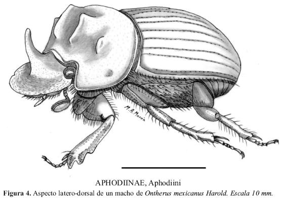 Ontherus Erichson. Se encontraron 11 machos y 9 hembras de O. mexicanus (Fig. 4) atraídos por el alumbrado público y la trampa de luz mercurial durante febrero (1), junio (14), julio (3) y octubre (2) en las localidades ubicadas en el km 13 Teziutlán-Hueyapan, y en el km 9 Teziutlán-Martínez de la Torre y San Diego.