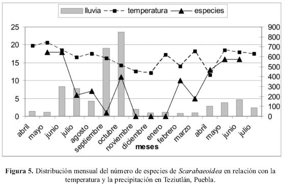 Aspectos fenológicos, ecológicos y faunísticos. Los coleópteros Lamellicornios de Teziutlán se encuentran activos casi todo el año, pero alcanzan su mayor abundancia en los meses de marzo, mayo, junio, julio y octubre (Fig. 5). Por lo general esto se debe a que en esos meses se presentan las lluvias mas intensas, y por lo tanto, las condiciones mas adecuadas para la alimentación y la reproducción. Este patrón de presenta en otras localidades del país ya estudiadas por Morón (1981, 1994), Morón & Deloya (1991), y Morón-Ríos & Morón (2001). En cuanto al número de especies encontramos que los meses con mayor abundancia de especies son mayo y junio, con 18 especies, abril con 13 especies, octubre con 11 especies y febrero con 10 especies.