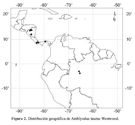 Con el registro de este género monotípico en el Brasil, se amplía su distribución en la región Neotropical (Figura 2), antes restricta a algunos países de Centro América y en localidades montañosas. Este hecho levanta la discusión sobre su distribución geográfica con una discontinuidad espacial, siendo posible inferir que es posible encontrar a A. taurus habitando los bosques húmedos de otros países amazónicos tales como Venezuela, Colombia, Ecuador, Perú y Bolivia, tanto en áreas de planicies como zonas montañosas de los Andes. Es importante resaltar que ejemplares de Bolivia fueron examinados por Ide (1998), sin embargo, carentes de datos de procedencia y fecha, lo que merece una confirmación en el futuro para este país.