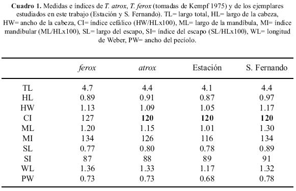 De manera preliminar y siguiendo la clave de Kempf (1975) he identificado a las dos obreras colectadas como T. ferox. Sin embargo, los criterios de separación de las especies del subgrupo 2 del grupo ferox, al que pertenece nuestra especie, aún no están claros. Los dos ejemplares son muy similares en cuanto a pilosidad, color, forma de las mandíbulas y en que ambos carecen de un dientecillo basal en las mandíbulas (Figs. 1a y 2a). Las diferencias entre ambos son el tamaño del cuerpo (Cuadro 1) y la microescultura de la cutícula. El ejemplar de la Estación (1) es más pequeño y presenta en todo el cuerpo "...fine, short vermiculate impressions resembling a very sparse, appresed pubescence" (Weber 1939, p. 98), mientras que el ejemplar de San Fernando (2) es de mayor tamaño y presenta estas marcas únicamente en la parte inferior de la cara anterior del peciolo y en la cara anterior del terguito I del gáster, en donde con adecuada iluminación pueden verse. De manera interesante, los dos ejemplares difieren en todas las medidas tomadas, excepto en el índice cefálico (CI), que es idéntico (Cuadro 1).